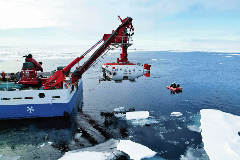 在中国大洋92航次第一航段中,“蛟龙”号载人潜水器实现我国首次北极冰区载人深潜,并在北极海域成功完成了10余次载人深潜。图为“蛟龙”号在北极冰区准备下潜(2025年8月11日摄)。刘诗平摄/本刊